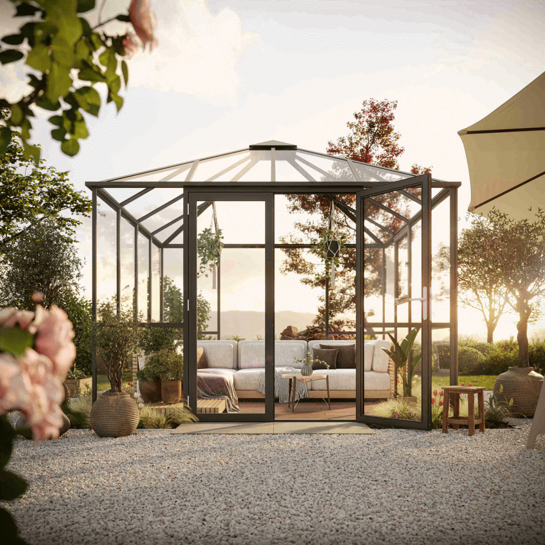 Mit PaviLux holen Sie sich ein hochwertiges, stilvolles und langlebiges Gewächshaus, das Ihren Garten in eine wahre Wohlfühloase verwandelt!